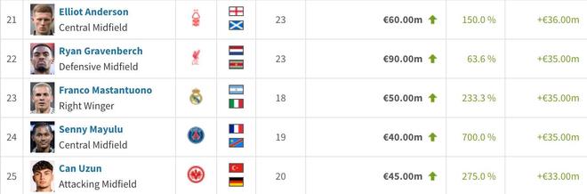 23. 马斯坦托诺(皇家马德里) +3500万欧元(+233.3%) 5000万欧元
